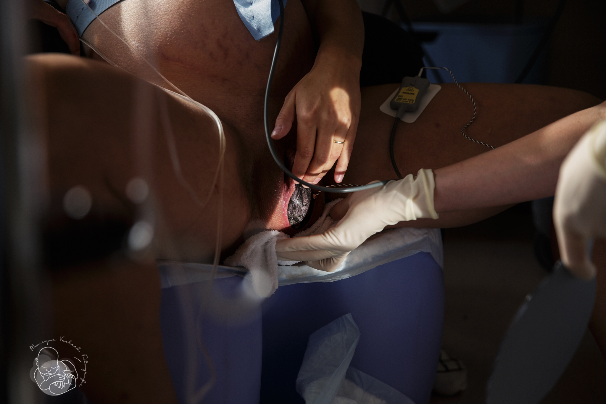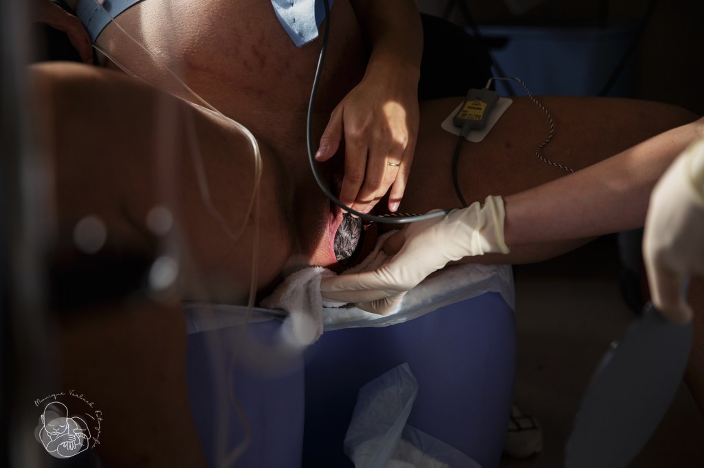 Na de geboorte van baby en placenta komt een minder leuke klus maar omdat mama zelf verloskundige is weet ze dat het hechten een secuur werkje is en dus best even kan duren.