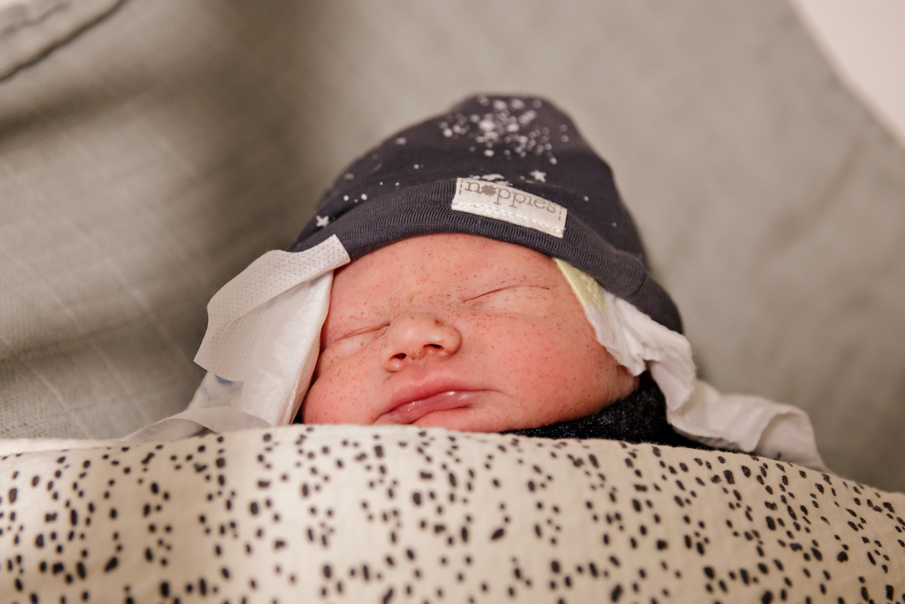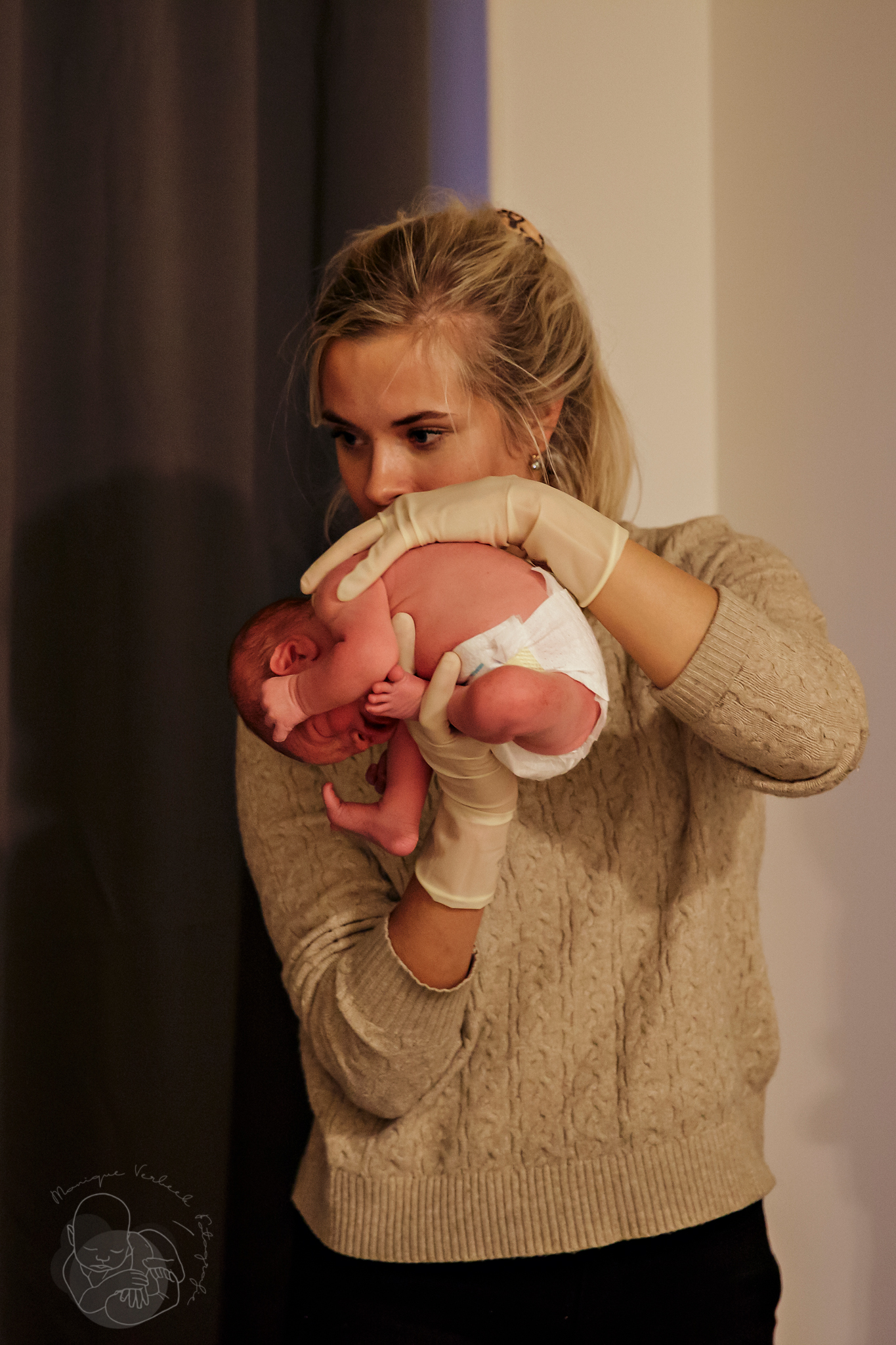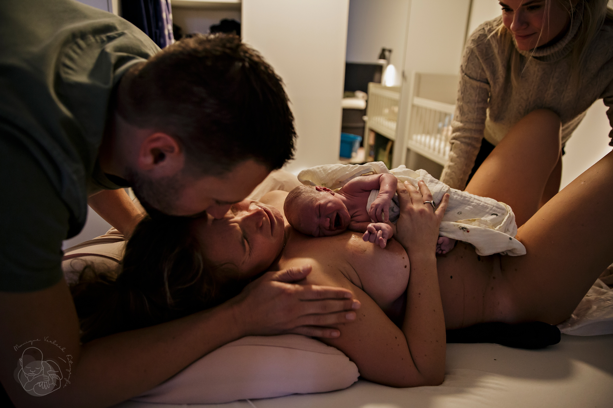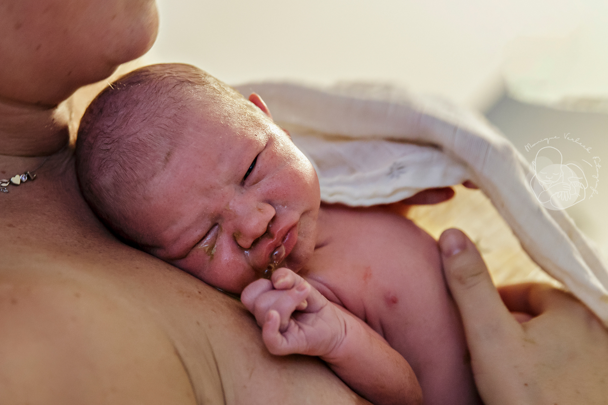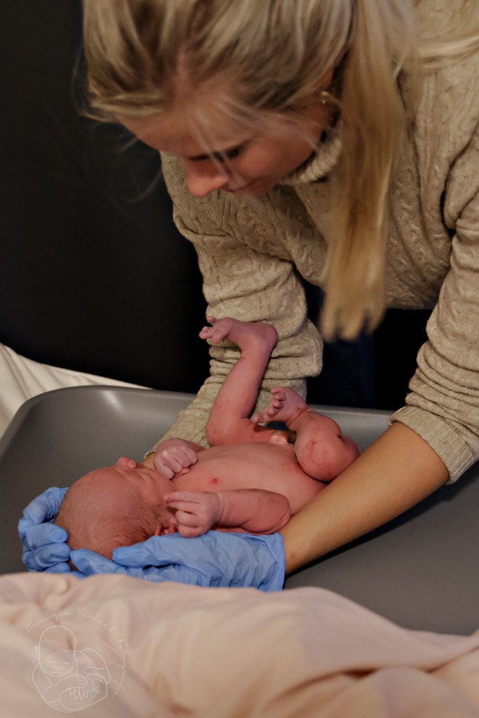 De voordeur stond al open en ik liep de slaapkamer binnen, gooide mijn jas uit en pakte mijn camera. Al op de eerste foto die ik nam was het hoofdje al zichtbaar. Deze kleine man had haast!