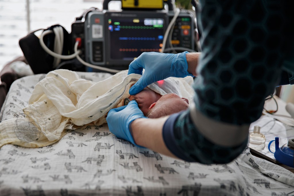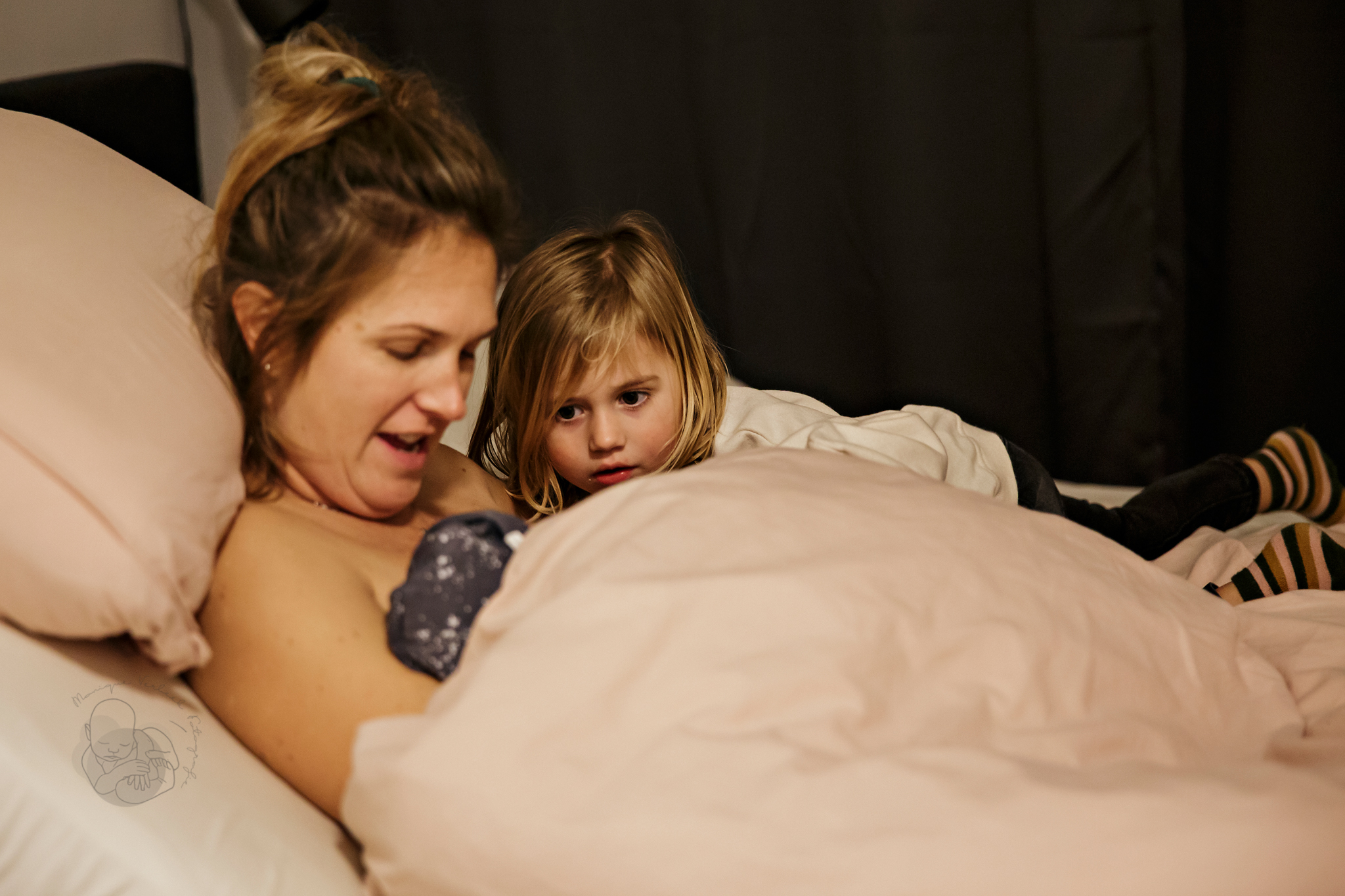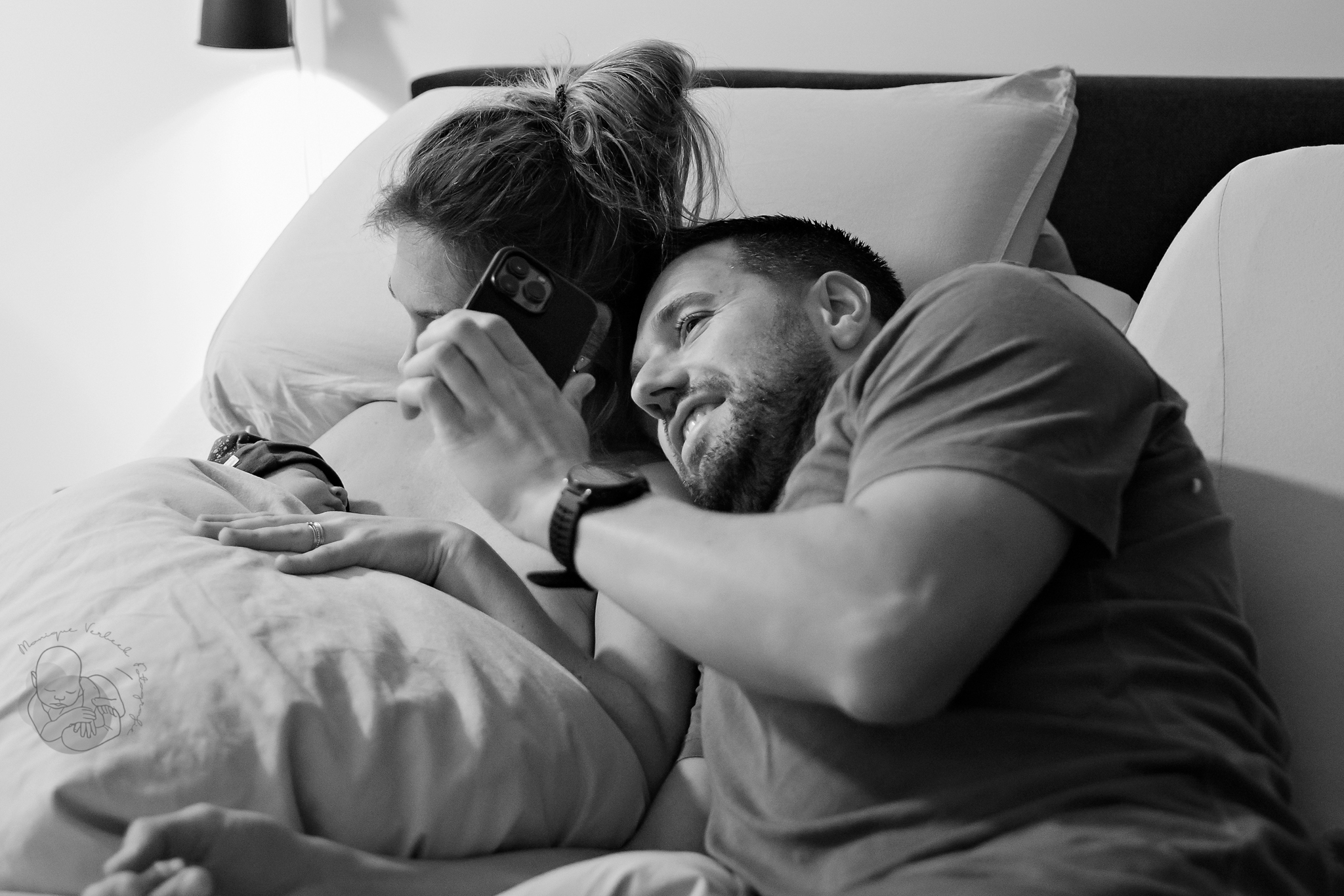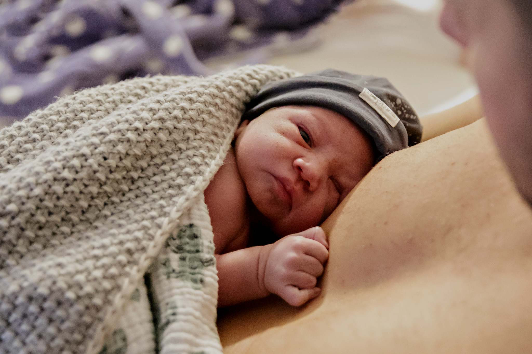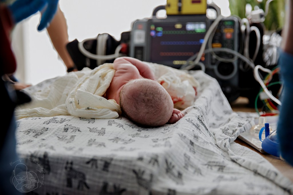 De voordeur stond al open en ik liep de slaapkamer binnen, gooide mijn jas uit en pakte mijn camera. Al op de eerste foto die ik nam was het hoofdje al zichtbaar. Deze kleine man had haast!