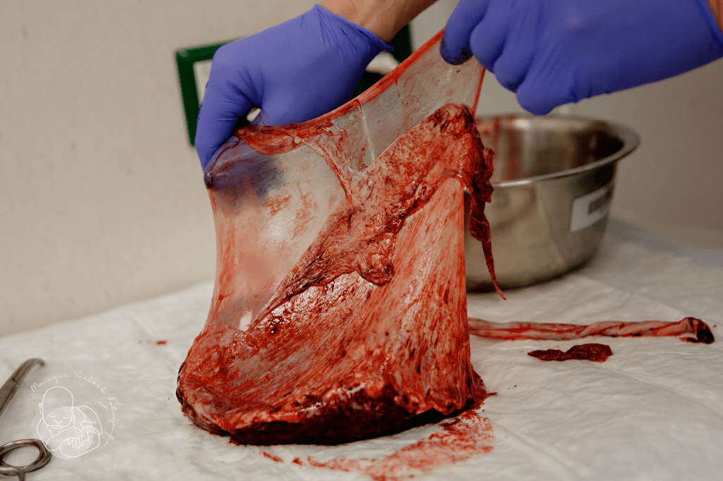 De verloskundige zal de placenta zorgvuldig nakijken om te zien of er geen stukjes achtergebleven zijn in de baarmoeder en wanneer je er naar vraagt zal ze hem uitgebreid laten zien. Heel mooi zijn de vliezen waarin baby zich negen maanden thuis heeft gevoeld.