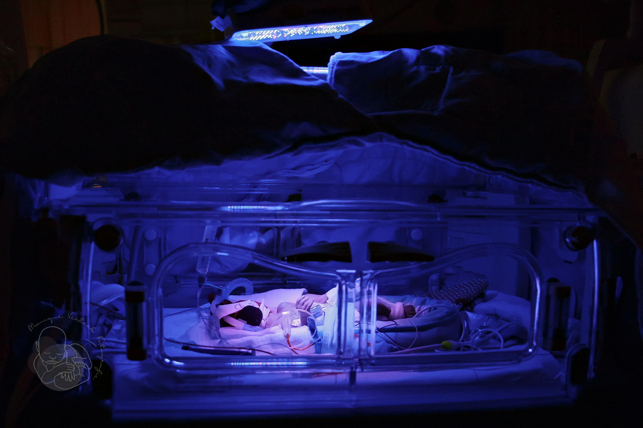 Jake ligt in de couveuse onder een ‘blauwe’ lamp. Dit heet fototherapie.