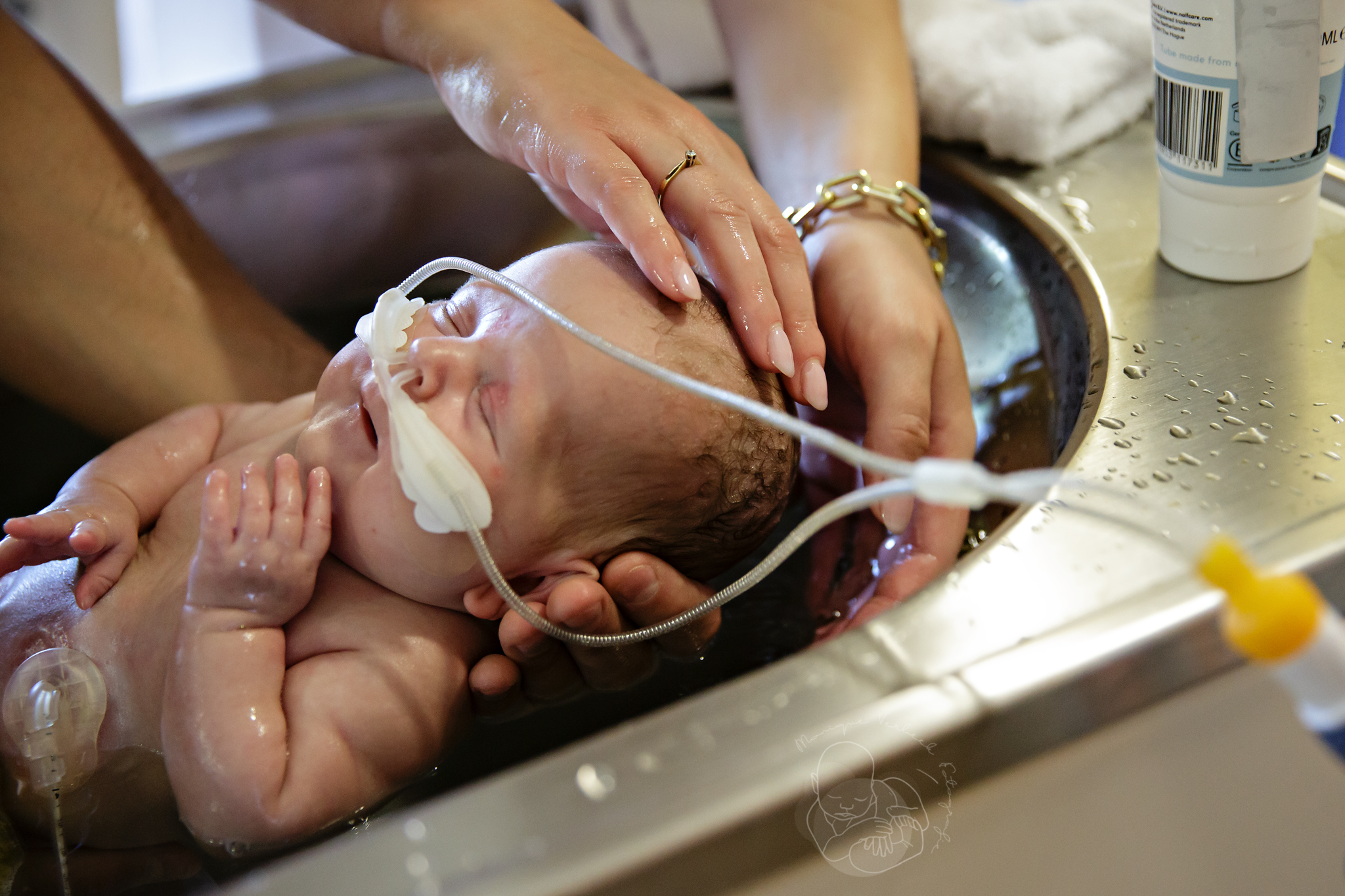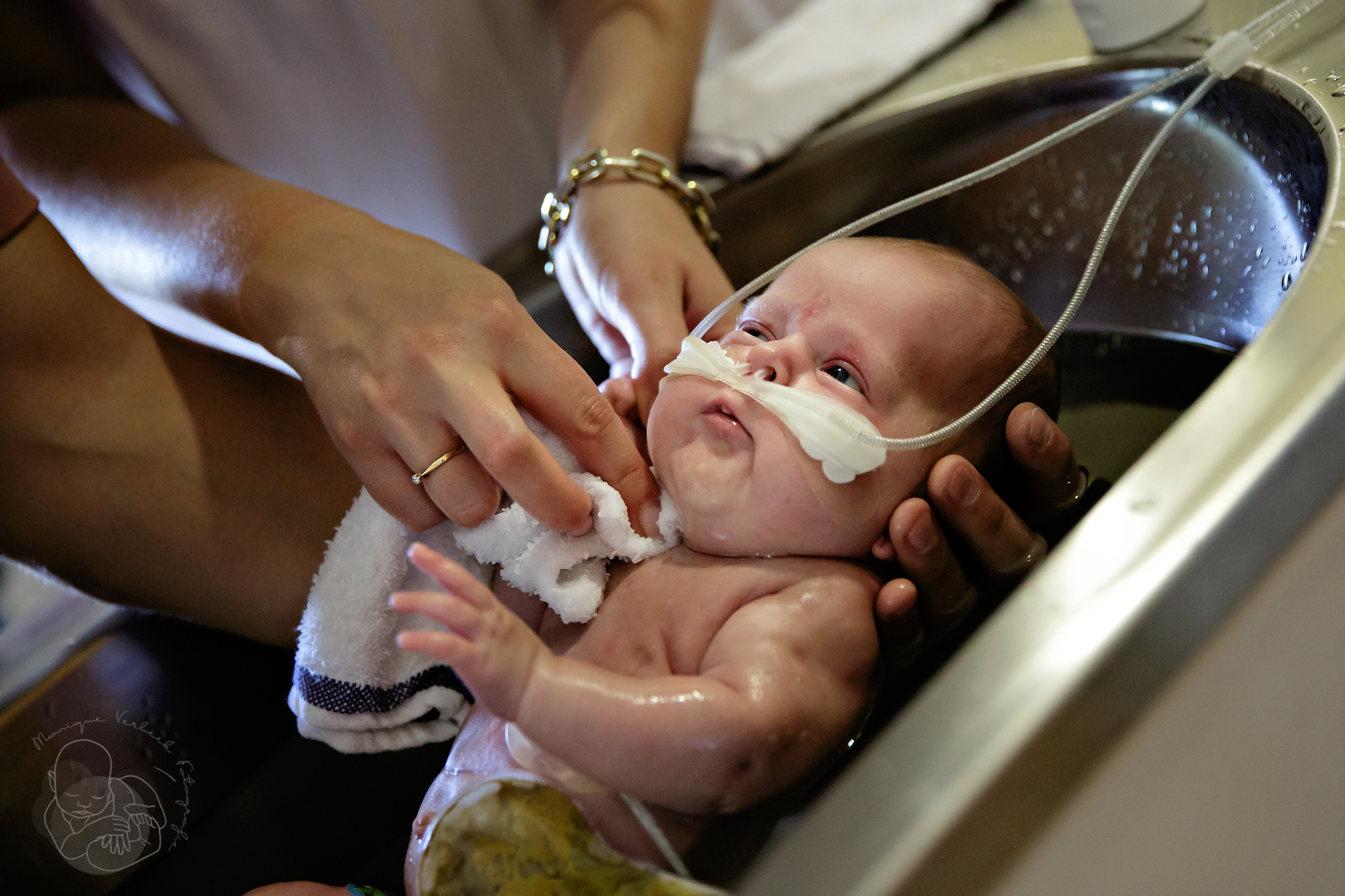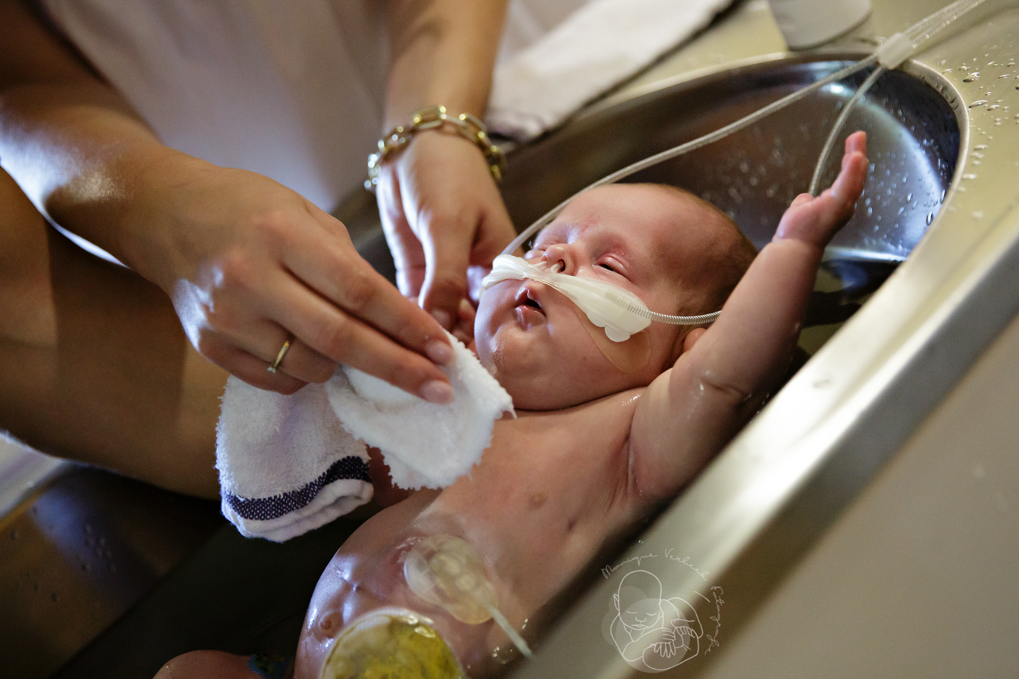 Papa houdt haar vast in bad terwijl mama haar lekker wast. Door het warme water komt het stomazakje vanzelf los zodat het daarna verwisselt kan worden.