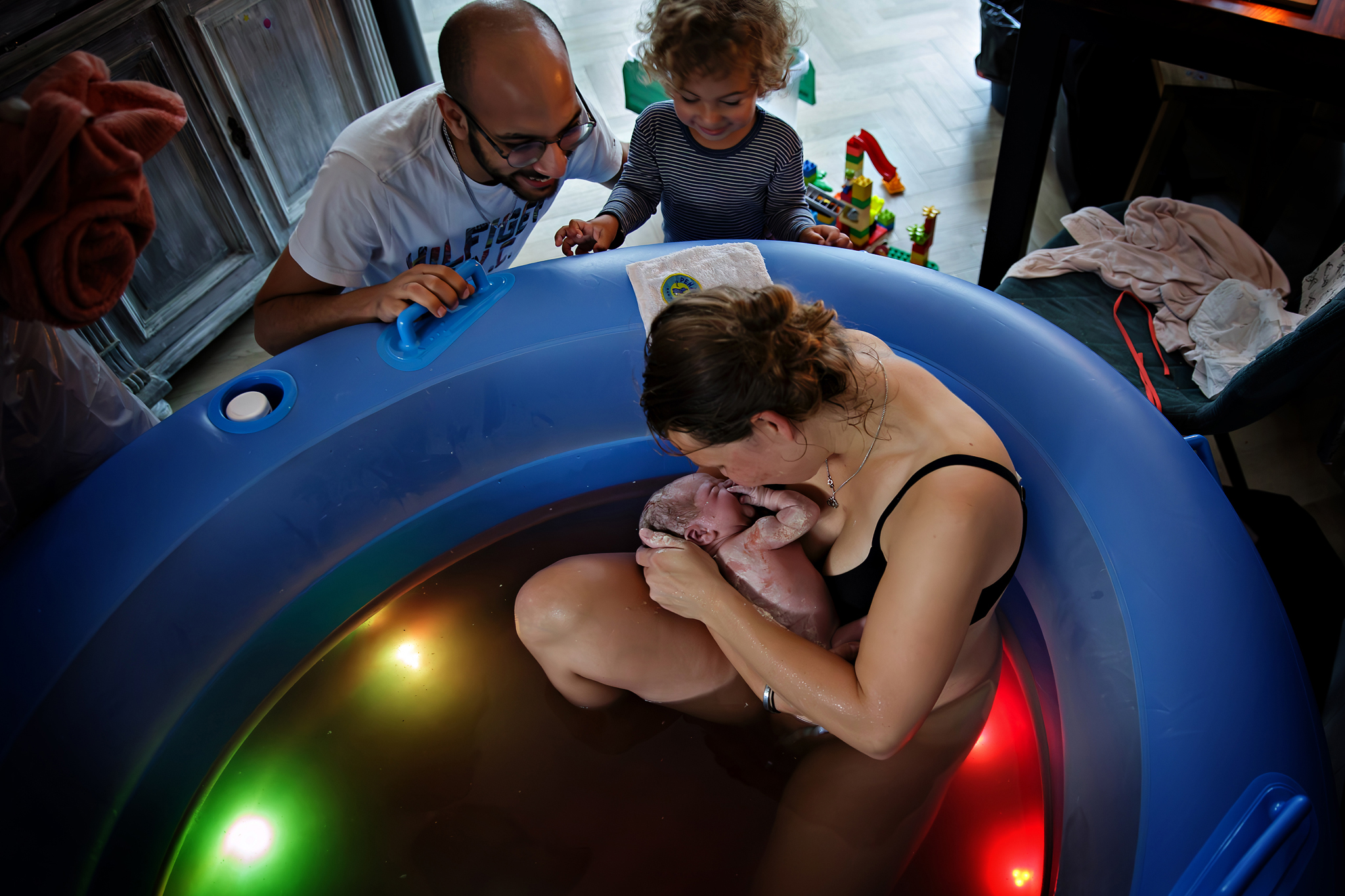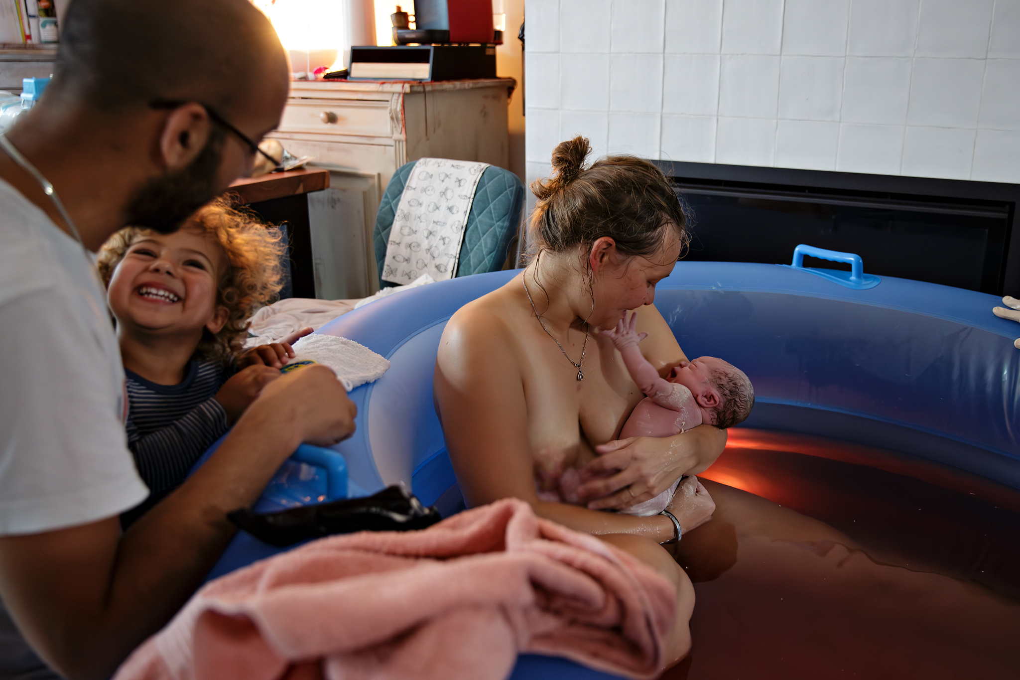 Toen ik aankwam deed de verloskundige de voordeur open. Ik deed mijn schoenen uit omdat ik wist dat de familie dat graag wilde. Op de achtergrond hoorde ondertussen grote zus voluit kletsen. Ik dacht nog even dat ik veel te vroeg zou zijn en liep zachtjes naar binnen. Daar zat mama heerlijk in het bevalbad, papa zorgde voor grote zus en liep heel behulpzaam heen en weer met koude washandjes voor mama en kaasstengels voor zus.