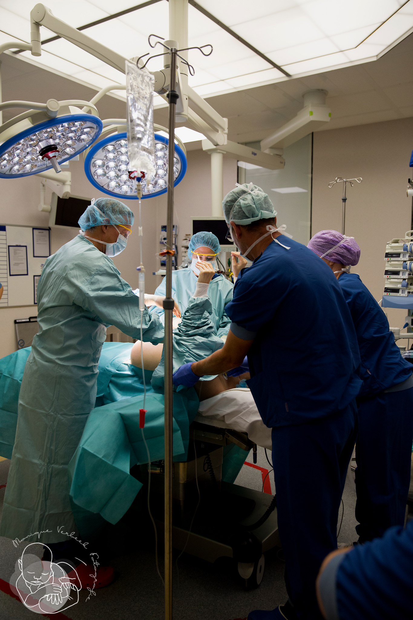 Ik had nog geen officiele toestemming (dat wordt soms pas op het laatste moment toegezegd) maar dankzij een heel lieve verpleegkundige van het Wilhelmina Kinderziekenhuis en een door mij afgelegde belofte van het volgen van protocol mocht ik mij in een pak hijsen en achter de dappere papa aan die zijn lief in haar bed naar de operatiekamers leidde