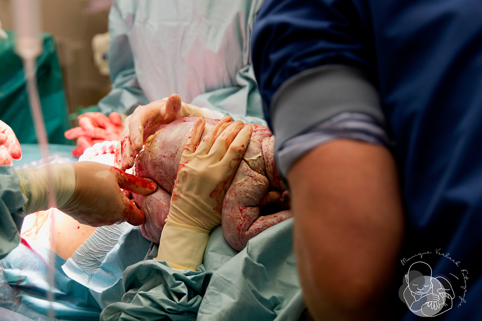De moeder moet haar handen omhoog houden om te voorkomen dat zij nog iets aanraakt. Zij krijgt van het team dezelfde steriele handschoenen aan als de gynaecoloog.